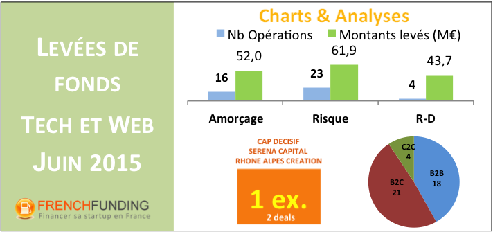 Analyse subjective des levées de fonds technos et web annoncées en juin 2015. Nous ne sommes pas exhaustifs volontairement : on ne prend en compte que les levées supérieures à 100k€ communiquées dans les média, je n’intègre pas les biotech pures (mais les med-tech si), les levées cap-dev (CA>3M€) et les levées très loin de la techno. Nous nous intéressons quasi exclusivement aux startups françaises. Les levées sont triées par stade d’avancement de la start-up selon la typologie suivante :
