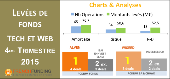 Analyse subjective des levées de fonds technos et web annoncées au quatrième trimestre 2015. Nous ne sommes pas exhaustifs volontairement : on ne prend en compte que les levées supérieures à 100k€ communiquées dans les média, je n’intègre pas les biotech pures (mais les med-tech si), les levées cap-dev (CA>3M€) ne sont pas analysées dans les charts. Nous nous intéressons quasi exclusivement aux startups françaises. Les levées sont triées par stade d’avancement de la start-up selon la typologie suivante :