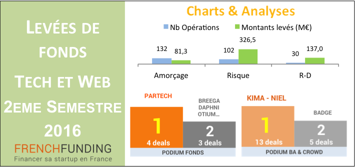 Voici donc avec beaucoup de retard le bilan S2 2016. Nous avons identifié 264 levées de fonds (pour des sociétés de moins de 3 M€ de CA) pour un montant de 544 M€. On est dans la continuité de S1 2016 en nombre de deals et en montant.